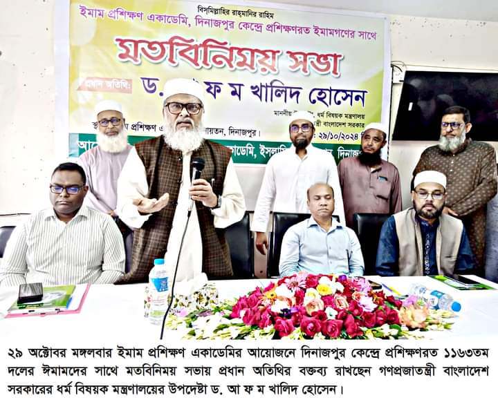 মোঃ জাহিদ হোসেন, দিনাজপুর প্রতিনিধি ॥ গণপ্রজাতন্ত্রী বাংলাদেশ সরকারের ধর্ম বিষয়ক মন্ত্রণালয়ের উপদেষ্টা ড. আ ফ ম খালিদ হোসেন বলেছেন, ধর্ম মন্ত্রণালয়ের হাজীদের নিয়ে ব্যবসা করে না-তাদের সেবা দিয়ে থাকে। ২০২৫ সালে যে হজ্ব অনুষ্ঠিত হতে যাচ্ছে তাতে আমরা খুব কম খরচে দুটি প্যাকেজ চালু করতে যাচ্ছি। ২৯ অক্টোবর মঙ্গলবার ইমাম প্রশিক্ষণ একাডেমির আয়োজনে দিনাজপুর কেন্দ্রে প্রশিক্ষণরত ১১৬৩তম দলের ঈমামদের সাথে মতবিনিময় করতে গিয়ে তিনি প্রধান অতিথির বক্তব্যে এই কথাগুলো বলেন। ইসলামিক ফাউন্ডেশন রংপুর বিভাগীয় কার্যালয়ের বিভাগীয় পরিচালক মোঃ আব্দুর রাজ্জাক এর সভাপতিত্বে স্বাগত বক্তব্য রাখেন ইমাম প্রশিক্ষণ একাডেমি দিনাজপুরের উপ-পরিচালক মোঃ আলমগীর হায়দার। এসময় উপস্থিত ছিলেন উপদেষ্টার একান্ত সচিব সাদেক আহমেদ, অতিরিক্ত জেলা প্রশাসক (শিক্ষা ও আইসিটি) এস.এম হাবিবুল হাসান। ইমাম প্রশিক্ষণ একাডেমির ধর্মীয় প্রশিক্ষক মাওঃ সাব্বির আহমেদ এর সঞ্চালনায় ইমাম প্রতিনিধিদের পক্ষে মাওঃ মোঃ আব্দুল মোত্তালেব শুভেচ্ছা বক্তব্য রাখেন। পবিত্র কোরআন থেকে তেলাওয়াত করেন হাফেজ মাওঃ মোঃ আনিসুর রহমান। ধর্ম উপদেষ্টা ড. আ.ফ.ম খালিদ হোসেন আরও বলেন, ইমাম সাহেবরা দেশ ও সমাজের আর্থ-সামাজিক উন্নয়নে কাজ করে যাচ্ছেন। সমাজ থেকে মাদক সহ সকল প্রকার অসামাজিক কর্মকান্ড প্রতিরোধে ইমাম সাহেবরা সামাজিকভাবে তাদের দায়িত্ব পালন করবেন। ঘুষ-দুর্নীতি প্রতিরোধ করে দেশের উন্নয়নে সম্পৃক্ত হয়ে ইমাম সাহেবরা যথেষ্টে ভূমিকা রাখতে পারেন। তিনি আরও বলেন, মনুষের অন্তরের রোগ নির্মুল করতে যেমন ডাক্তারের প্রয়োজন হয়, ঠিক তেমনি হিংসা, লোভ, দুর করতে ধর্মীয় অনুশাসনের প্রয়োজন রয়েছে। ইসলাম যে শান্তির ধর্ম তা সাধারণ মানুষের মাঝে প্রচার করার দায়িত্ব ইমাম সাহেবদের। বর্তমানে ইমাম ওলামাদের সহযোগিতায় ইসলামি নিয়ম-নীতি বোঝায় রেখে বিনা বাধায় সবাই ধর্ম পালন করছে। প্রশিক্ষণপ্রাপ্ত ইমাম-মুয়াজ্জেম কল্যাণ ট্রাস্টের মাধ্যমে বিনা সুদে ঋণ প্রদান করা হচ্ছে। ইমামদের উন্নয়নে আমরা “ইমাম” নামের মিনারেল ওয়াটার এর একটি প্রজেকক্ট শুরু করতে যাচ্ছি। সার্বিক তত্ত্বাবধায়নে ছিলেনমোঃ আজাদ কামাল রনি।